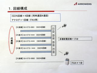 通常、このようなケースでは、1回線で同時に2通話できるISDN回線を4回線、別途ファクス専用にアナログ回線1回線の計5回線の電話回線を引きます。そこで、5回線だと電話回線の開通までに時間がかかる可能性があることをお伝えしました。
