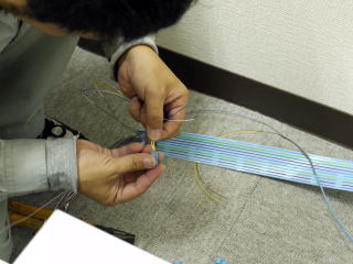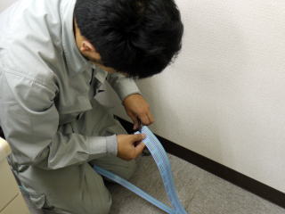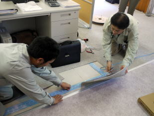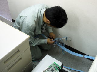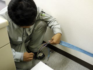 次に、他2名でビジネスフォン電話機と主装置をつなぐ配線を行います。実は、床によって配線方法は異なります。OAフロア(床が底上げされているタイプ)の場合、床下に電話ケーブルが配線できます。この場合、電話ケーブルは通常の安価なタイプが利用できます。ただし、OAフロア床以外は、注意が必要です。