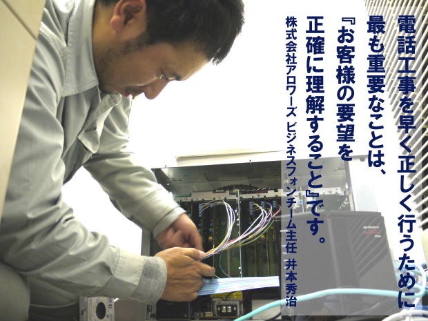 ビジネスフォンチームで主任を務める井本秀治のある電話工事現場を密着取材。実際の工事現場の様子やビジネスフォン工事のポイント、この仕事にかける思いなどをご紹介します。