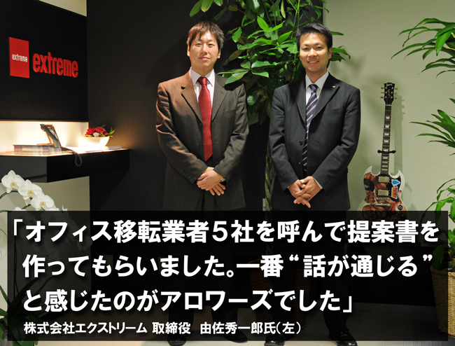 ソフトウェア開発会社の株式会社エクストリームでは、2010年9月、オフィスの移転・拡張にアロワーズの「THEオフィス移転」を利用しました。取締役の由佐秀一郎氏(写真左)に、「THEオフィス移転」を利用した経緯、感想などをうかがいました(写真右はアロワーズ担当 佐野)。